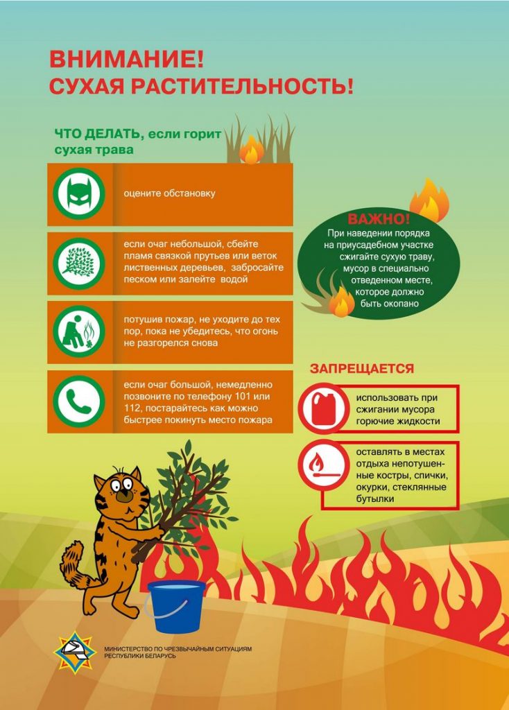 •ни в коем случае не жгите траву. Кроме того, что это вредно для растений и животных, палы могут быть опасны и для человека. Не оставляйте горящий огонь без присмотра. Тщательно тушите окурки и спички перед тем, как выбросить их;