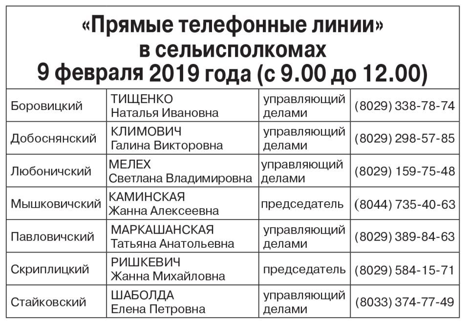 «Прямые телефонные линии» в сельисполкомах 9 февраля 2019 года (с 9.00 до 12.00) Газета Кiравец 8 февраля 2019 15:19 Теги