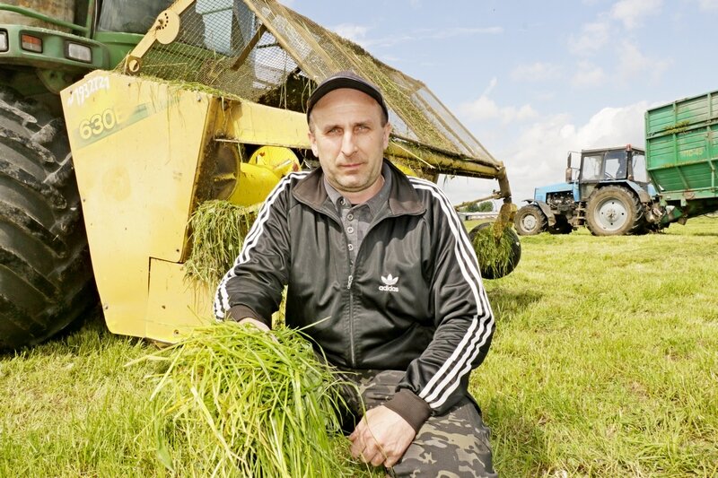 И вот в дело вступили кормоуборочные комбайны. Привычное дело – кормозаготовка – для опытного Константина Петруши, который не первый сезон управляет «New Holland». На «John Deere» трудится Виталий Щербич. Мощные машины быстро убирают зеленые ряды и превращают их в зеленную массу, которой под напором наполняются кузова рядом идущих самосвалов и тракторных прицепов ПИМ. Здесь же, в поле, постоянно дежурит пожарная машина – водитель Евгений Рублевский – всегда начеку.