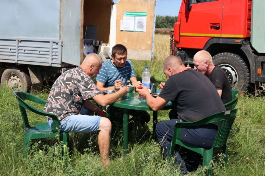 У мінулую пятніцу, 19 ліпеня, рэдакцыйны аўтамабіль накіраваўся на сельгаспалеткі ААТ “Кіраўскае райаграпрамтэхзабеспячэнне”, працаўнікі якога завяршалі ўборку азімага рапсу. Гэтая культура ў сельгасарганізацыі была пасеяна на плошчы ў 550 гектараў. У раёне паміж Любонічамі і Сяргеевічамі поле чорнага золата (так у народзе называюць азімы рапс, вырошчванне якога прыносіць добры прыбытак) у 60 гектараў абмалочвалі адразу шэсць камбайнаў. Мы паспелі якраз падчас перапынку – прама ў поле працаўнікам прывезлі абед, бутэлькі з пітной вадой. Атрымаўшы гарачае харчаванне – першае, другое і кампот, камбайнеры размясціліся за абедзеннымі столікамі. За ежай абмеркавалі паміж сабой ход жніва. На ўсё пра ўсё – некалькі хвілін, і з новымі сіламі хутчэй у поле: пакуль стаяла спрыяльнае надвор’е, варта было завяршыць уборку рапсу на гэтым участку і рухацца далей. Да слова, абеды і вячэры для працаўнікоў палёў – найсмачнейшыя, сытныя і разнастайныя. Кухонны работнік Таццяна Слуцкая расказала, што кожны дзень сталовая РАПТЗ рыхтуе каля 120 абедаў, прыкладна 30 вячэр, кормяць работнікаў сваёй арганізацыі, а таксама СГФ “Чыгірынка” РУП “Беларуснафта-Магілёўаблнафтапрадукт”, буд­атрадаўцаў і работнікаў, якія працуюць на будаўніцтве новай фермы ў Пацавай Слабадзе. Асабліва да спадобы аграрыям баршчы і расольнікі, а на другое – шніцэль. Меню разнастайваюць пловам, рыбнымі стравамі, гуляшамі са свініны і ялавічыны, абавязкова на абедзенным стале – гародніна. Ежу хлебаробам арганізацыі развозіць малады вадзіцель Яўген Кірылаў, які працуе другі год. Вадзіцель Сяргей Лянкевіч дастаўляе абеды на астатнія аб’екты.