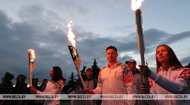 Эстафета «Пламя мира» II Европейских игр прибыла на площадь Государственного флага в Минске, передает корреспондент БЕЛТА. На заключительном отрезке маршрута в эстафете приняли участие четырехкратная олимпийская чемпионка по биатлону Дарья Домрачева, олимпийский чемпион в гребле на каноэ Александр Богданович и чемпионка мира по легкой атлетике Марина Арзамасова.