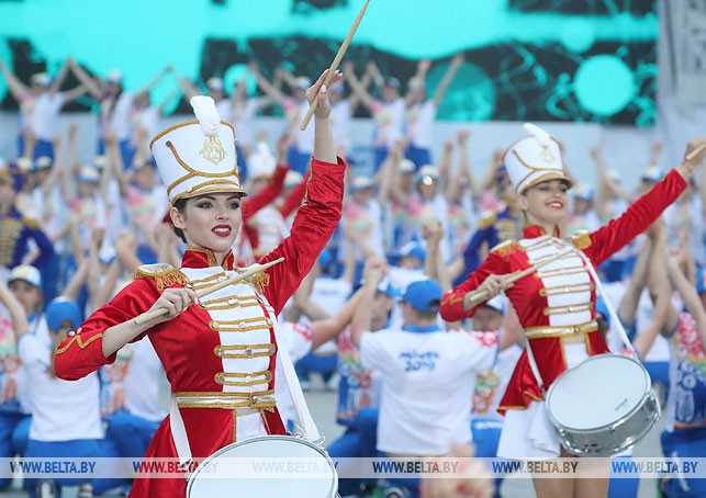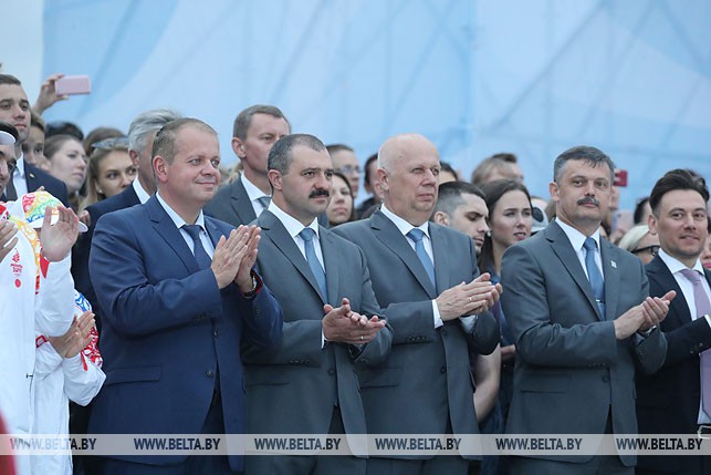 На площади Государственного флага состоялся праздничный концерт, участие в котором приняли многие ведущие артисты Беларуси. Популярный певец Иван Вабищевич и участница детского конкурса «Витебск-2019» Ксения Галецкая исполнили песню «Пламя мира».