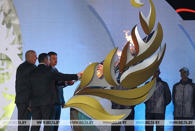 Факел II Европейских игр был передан председателю Мингорисполкома Анатолию Сиваку, исполняющему обязанности первого вице-президента Национального олимпийского комитета Беларуси Виктору Лукашенко и министру спорта и туризма Беларуси Сергею Ковальчуку. Огонь был зажжен в специальной чаше на площади Государственного флага, а после трехкратный олимпийский чемпион по вольной борьбе, участник эстафеты Олимпиады-80 Александр Медведь передал факел современному поколению белорусских спортсменов: самбисту Степану Попову, бегунье Эльвире Герман и марафонке Ольге Мазуренок.