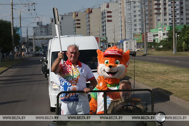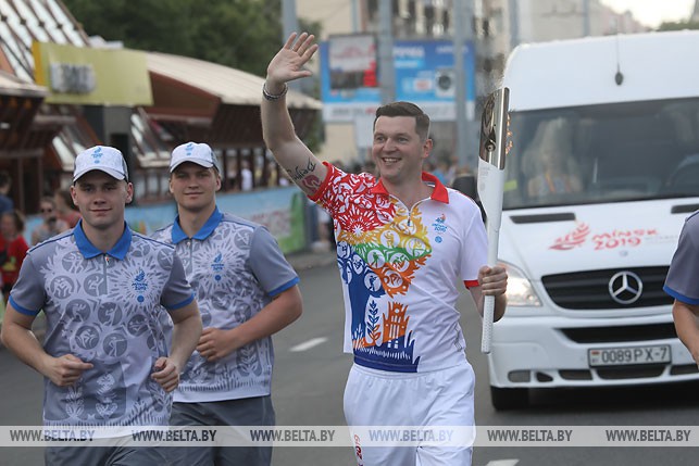 Рад встрече с родным городом и известный актер театра и кино, театральный режиссер Павел Харланчук-Южаков. Он пожелал спортсменам достойно представить республику на мультиспортивном состязании. «Важно, чтобы они превзошли свои личные рекорды: пробежали быстрее, чем могут, нырнули глубже, чем могут. Сделали невозможное», — сказал актер. В последующем на разных участках маршрута факел перешел к заслуженному мастеру спорта СССР, серебряному призеру Олимпийских игр (1992), чемпиону мира по вольной борьбе, заслуженному тренеру Беларуси Сергею Смалю, основателю и руководителю международного форума моды Belarus Fashion Week Янине Гончаровой.