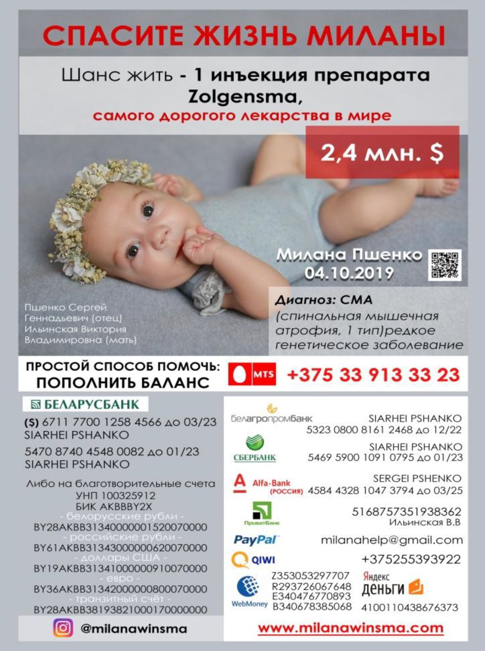 Мы, Пшенко Сергей Геннадьевич и Ильинская Виктория Владимировна, родители Пшенко Миланы Сергеевны (04.10.2019г.р.), попали в трудную жизненную ситуацию. В нашу...